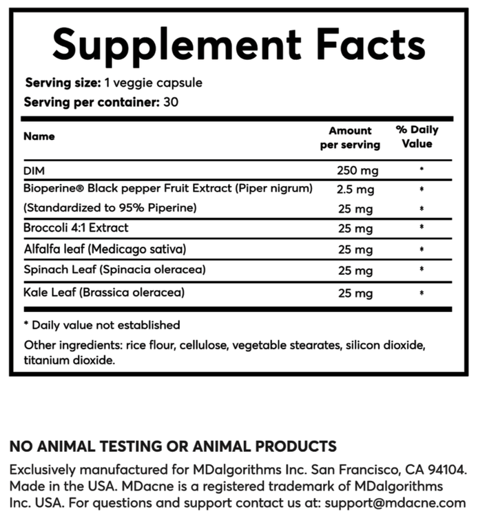- MDacne’s formulations are vegan, drug-free, and enriched with ingredients like DIM, Milk Thistle, and CoQ10 for targeted, whole-body acne care.