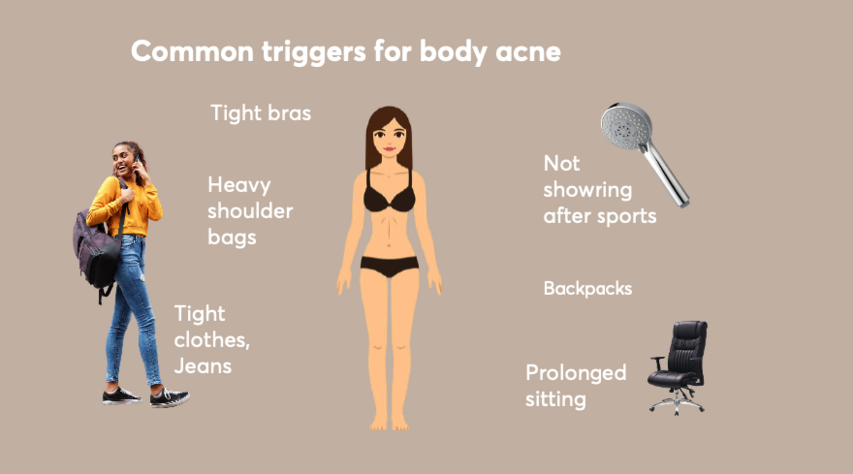 - Chest Acne: Caused by similar factors as bacne; tight sports bras and synthetic fabrics can contribute.