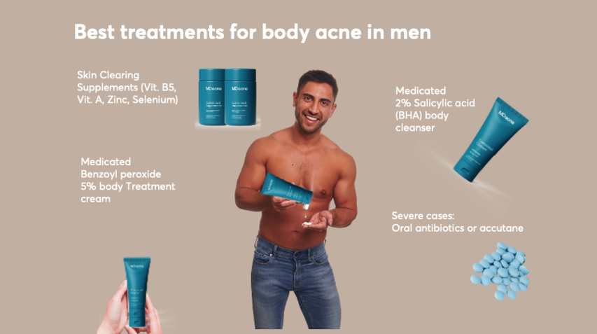 For optimal results, treat body acne with a medicated cleanser and a leave-on treatment. Topical treatments with salicylic acid and benzoyl peroxide are effective. For severe cases, consult a dermatologist for additional treatments like antibiotics or Accutane.